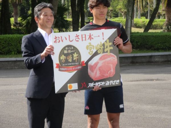 宮崎県スポーツランド推進課 課長 岩本 真 様よりあいさつの後、岩本課長より、宮崎牛5kgの贈呈を分藤太一(ぶんどう たいち)選手が受け取りました。