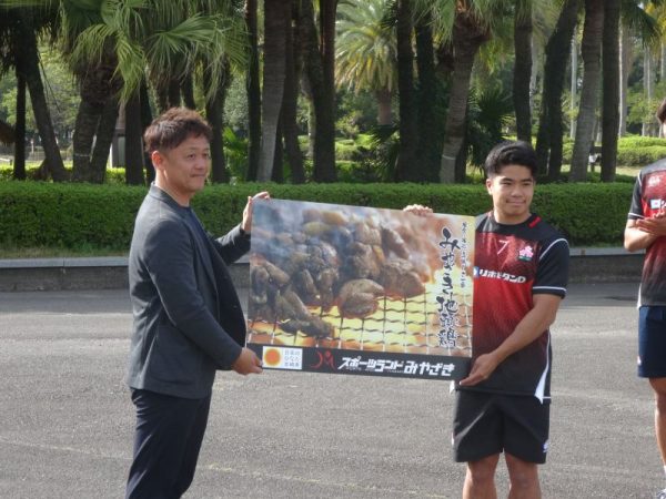 続きまして、宮崎市スポーツランド推進課 課長 矢野将大 様より、みやざき地頭鶏5kgを林 駿吾(はやし しゅんご)選手が受け取りました。