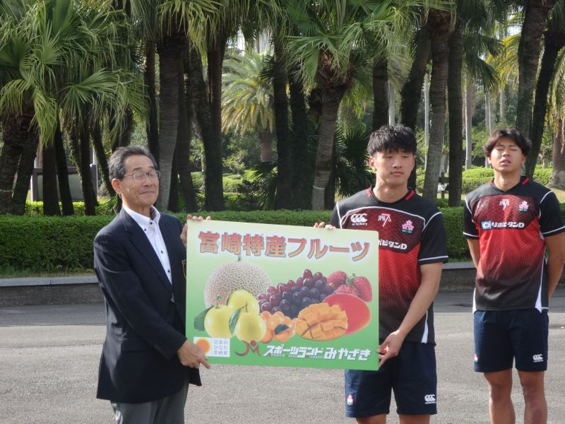 最後に本協会会長 石田喜克より、宮崎県産フルーツを金田涼太(かねだ りょうた)選手が受け取りました。