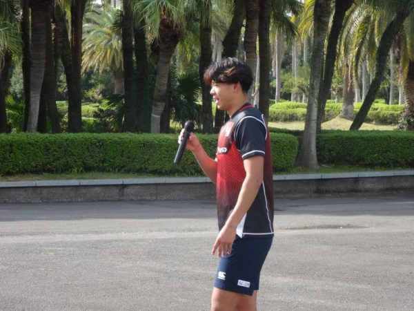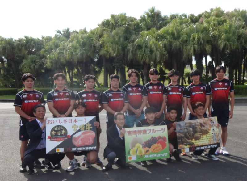 4月7日、ひなた宮崎県総合運動公園 新トレーニング場前にて「男子セブンズシニアアカデミー」歓迎セレモニーおよび贈呈式が行われました。
